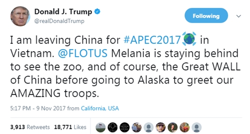 "Tôi đang rời Trung Quốc đến #APEC2017 ở Việt Nam. Đệ nhất phu nhân Melania sẽ ở lại để thăm vườn thú, và tất nhiên, Vạn lý Trường thành tại Trung Quốc trước khi tới Alaska chào đón các binh sĩ tuyệt vời của chúng ta", Tổng thống Mỹ Donald Trump viết trên Twitter cá nhân hôm nay.