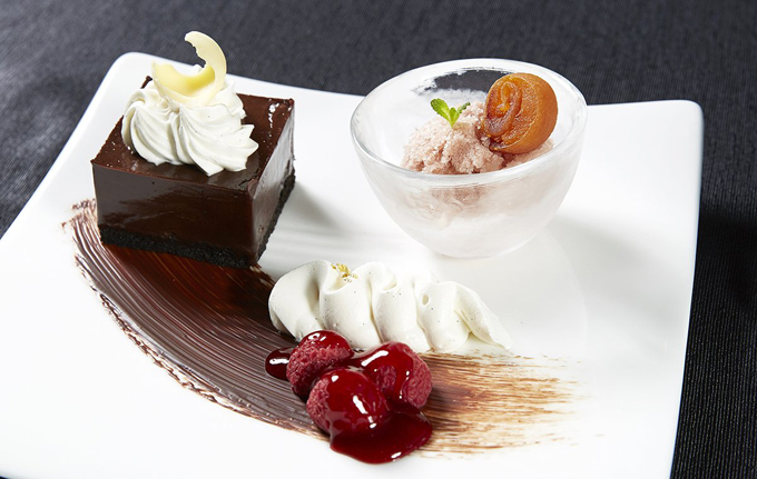 Món tráng miệng gồm có bánh kem chocolate phủ vani, mâm xôi và đá bào vị quế ăn kèm với quả hồng khô. Hồng là đặc sản mang tính chất "quốc hồn quốc túy" của bán đảo Triều Tiên. Đặc biệt, thời điểm này là mùa vụ thu hoạch hồng ở Hàn Quốc nên những trái hồng sẽ có hương vị thơm ngọt nhất.