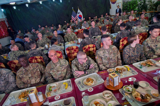 Ông Trump còn dành thời gian tới dùng bữa cùng các binh sĩ tại trại Humphreys, đơn vị đồn trú của lính Mỹ ở Hàn Quốc. Tổng thống Trump và Tổng thống Hàn Quốc Moon Jae-in cùng 108 binh sĩ, gồm 20 binh sĩ Hàn Quốc, dùng bữa trưa với các món ăn Mexico theo đúng thực đơn của ngày thứ ba tại khu trại, không có bất cứ đãi ngộ hay thay đổi đặc biệt nào.