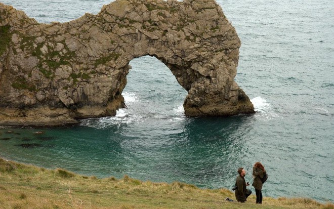 Khoảnh khắc tuyệt đẹp và riêng tư của một cặp đôi được ghi lại cho thấy người bạn trai với gương mặt rạng rỡ hạnh phúc đang quỳ xuống cầu hôn bạn gái của mình ngay trước khung cảnh thiên nhiên hùng vỹ của vòm đá vôi Durdle Door nổi tiếng tại Dorset, Anh.