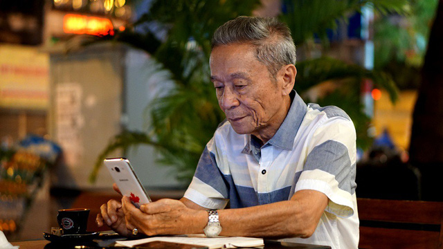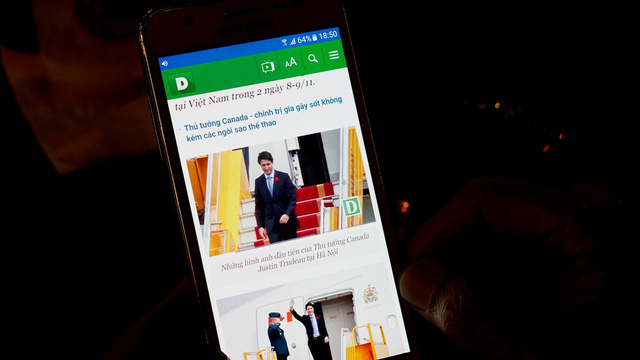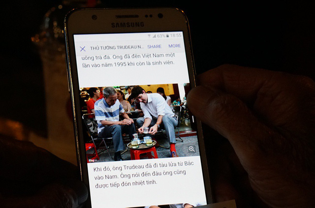 Thủ tướng chỉ nhấp vài ngụm cà phê chứ không uống vì cà phê Sài Gòn khá đậm. (Ảnh: Ông Hiệp mở lại các bài viết trên mạng xem lại hình ảnh của mình và Thủ tướng Canada Trudeau)
