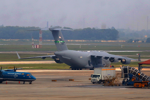 Nhiều máy bay vận tải của Mỹ đã hạ cánh ở Nội Bài đưa phương tiện, các thiết bị đồ dùng hậu cần cho đoàn Tổng thống Mỹ ở Hà Nội. Ảnh: Bá Đô