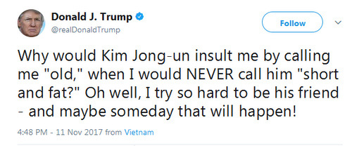 "Tại sao Kim Jong-un lại bôi xấu tôi bằng cách chê tôi già, trong khi tôi không bao giờ chê anh ta thấp và béo? Tôi rất cố gắng để trở thành bạn của anh ta, điều này có thể trở thành hiện thực vào một ngày nào đó", Tổng thống Mỹ viết trên Twitter hôm 11/11 khi vừa đặt chân tới Hà Nội, AFP đưa tin.