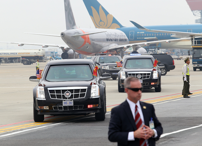 Hai chiếc Cadillac "Quái thú" tiến vào nơi đậu Air Force One.