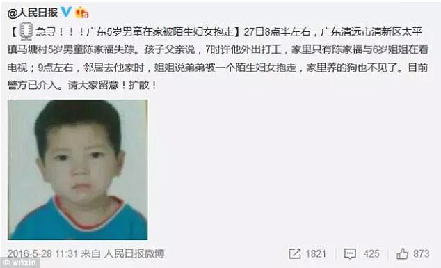 Cách đây ít ngày, 3 kẻ bắt cóc đã bị tuyên án lần lượt từ 2 tới 6 năm tù. Tờ Nhân dân Nhật báo cho biết bé trai họ Trần bị bắt cóc hồi tháng 5.2016 tại làng Mã Đường ở tỉnh Quảng Đông. Bố cậu bé cho biết anh phải đi làm cả ngày nên để con trai ở nhà cùng con gái cả. Hai đứa bé trông nhau mỗi ngày và thường xem TV cho tới lúc bố về.