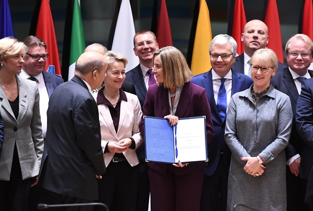 Các ngoại trưởng và bộ trưởng quốc phòng EU tập trung tại lễ ký ở Brussels (Bỉ) để đại diện cho 23 chính phủ tham gia hiệp ước, dọn đường cho các lãnh đạo EU ký văn bản này trong tháng 12.