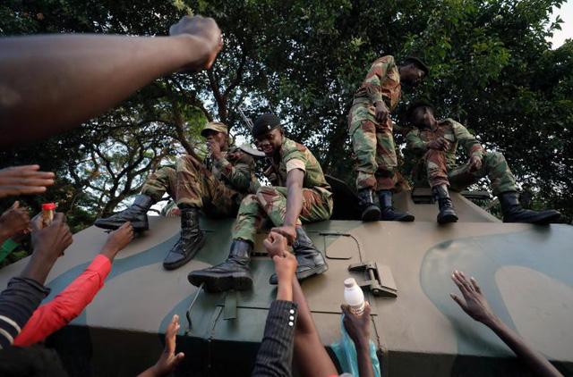 Người dân bắt tay và tặng hoa cho các binh sĩ ở thủ đô Harare sau 1 tuần khống chế buộc ông Mugabe từ chức. (Ảnh: Reuters)