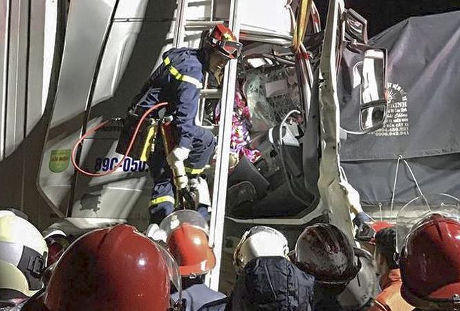 Không dừng lại đó, chiếc container tiếp tục đẩy xe tải vào đuôi một chiếc xe khách đi cùng chiều. Cú đâm quá mạnh khiến chiếc xe đầu kéo bẹp dúm, tài xế, 1 phụ xe bị mắc kẹt trong cabin và tử vong.