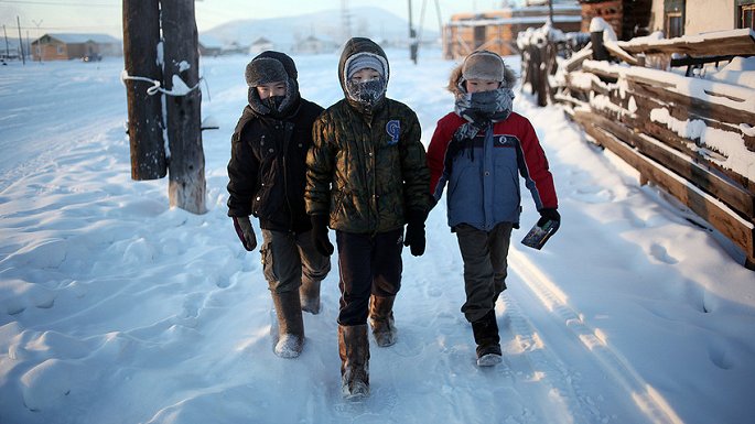 Tại ngôi làng Oymyakon ở Yakut, Nga, trẻ em vẫn đi học bình thường ngay cả khi nhiệt độ xuống dưới -50°C. Khi nhiệt độ giảm đến -52°C, chỉ có học sinh từ lớp 1 đến lớp 5 được nghỉ.