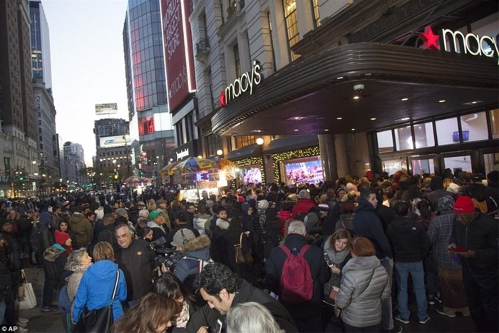Quảng trường Herald của Macy's ở Manhattan chứng kiến một lượng khổng lồ người xếp hàng ngoài cửa để chờ mua những thứ đồ sale off mạnh như bộ dụng cụ mỹ phẩm và nước hoa có giá chỉ từ 10 đến 20USD. Macy’s cũng là nơi cung cấp 40% lượng giày dép cho thị trường Mỹ. (Ảnh: AP)