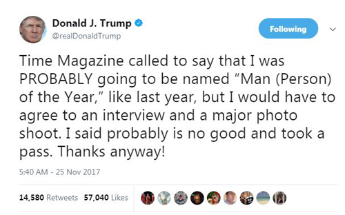 "Tạp chí Time đã gọi để nói rằng tôi CÓ THỂ sẽ được vinh danh là 'Người đàn ông (Nhân vật) của năm', giống như năm ngoái, nhưng tôi sẽ phải đồng ý trả lời phỏng vấn và chụp hình. Tôi nói có thể chẳng hay ho gì và từ chối. Dù sao cũng cảm ơn", USA Today dẫn tweet tổng thống Mỹ đăng tối qua.