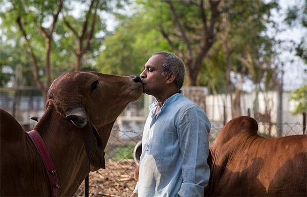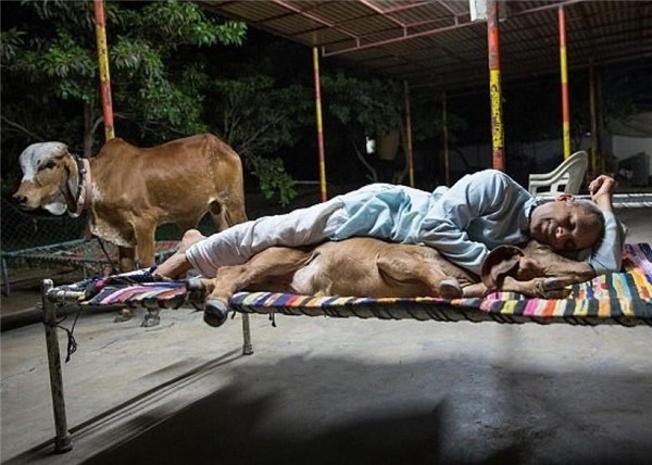 Ông Vijay Parsana, 44 tuổi, sống tại Ấn Độ đã dành rất nhiều tình cảm cho những con bò của mình. Ông gắn bó mật thiết với chúng: tắm, cho ăn và chia sẻ chiếc giường ngủ của mình với bò.