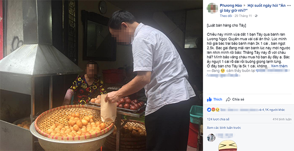 "Chiều nay, mình vừa dắt một bạn Tây qua hàng bánh rán L.N.Q mua vài cái ăn thử. Lúc mình hỏi giá bác trai bảo bánh mặn 3.000 đồng/cái, bánh ngọt 2.500 đồng/cái. Bác gái đang mải rán bánh lúc này mới ngước lên nhìn mình rồi bảo: 'Người Tây này đi với cháu hả?'. Mình bảo: 'Vâng! Cháu mua hộ bạn ấy đây ạ'. Bác ấy nguýt một cái rồi buông giọng lạnh lùng: 'Ở đây bán cho Tây là 5.000 đồng/cái, không mua thì đi chỗ khác nhé'.