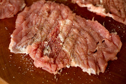 - Rắc muối tiêu lên một mặt của lát thịt heo.