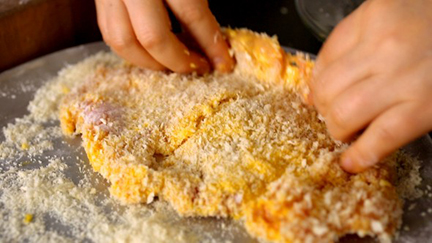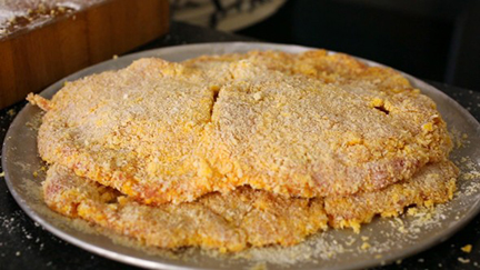 - Thả một lát thịt vào chảo dầu. Chiên cho tới khi cả hai mặt đều chuyển sang màu nâu. Trở qua trở lại nhiều lần, để cả bốn lát thịt đều chín vàng và dòn rụm.