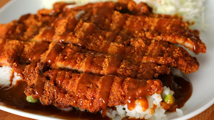 - Xếp lát thịt heo chiên dòn lên trên. Lại rưới thêm một lượt nước xốt thịt bò lên nữa.