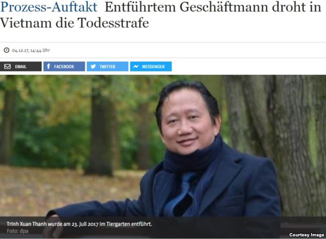 Hãng tin thông tấn Đức DPA, tuần báo Tấm Gương (Der Spiegel) và các tờ báo lớn khác của Đức hôm 4/12 đăng tải thông tin cựu doanh nhân 51 tuổi Trịnh Xuân Thanh, người mà Bộ ngoại giao Đức cho là bị mật vụ Việt Nam bắt cóc ở Berlin cuối tháng 7, sẽ bị đưa ra tòa xử vào tháng 1/2018.