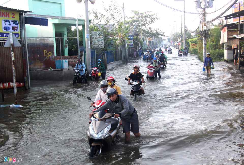 Triều cường ở một số khu vực tại TP.HCM đạt đỉnh vào sáng nay 6/12. Triều cường dâng cao khiến một số tuyến đường ngập sâu trong nước. Những người đi đường phải dắt bộ vì xe chết máy...