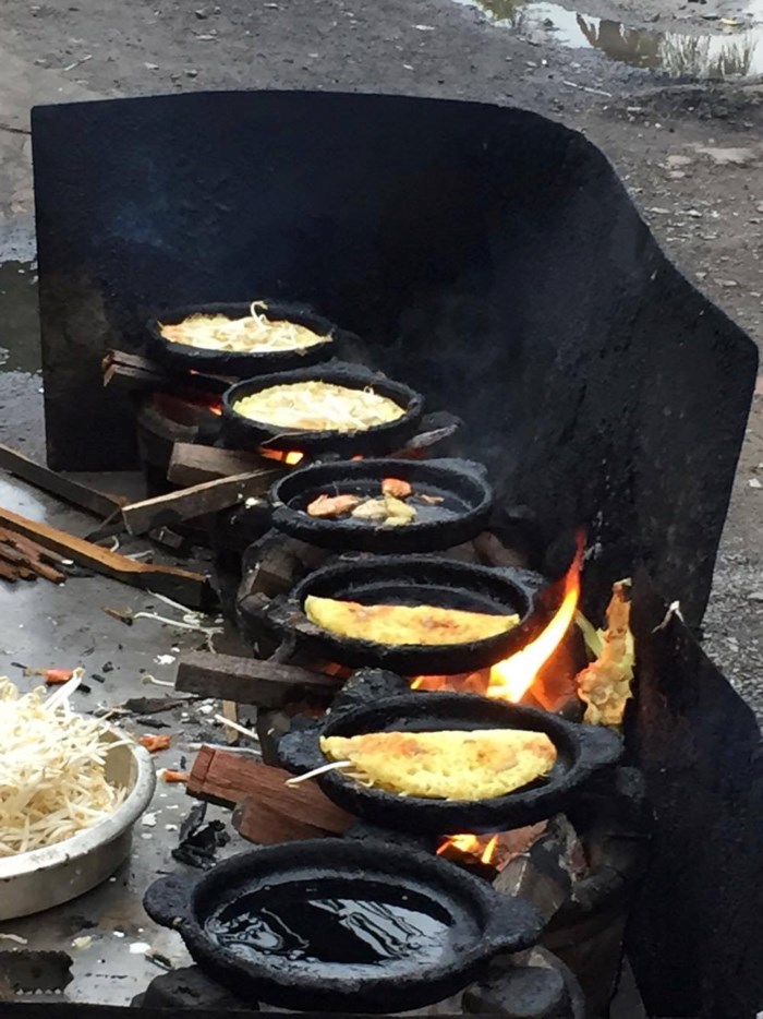 Họ thích thú khi hơi ấm từ bếp lửa tỏa ra vừa đủ để xóa tan cái lạnh tê tái của những cơn mưa. Bánh mới đổ nóng bỏng tay, vừa ngầy ngậy vừa thơm thoảng mùi hành lá, lại thêm cái giòn tan lớp vỏ bên ngoài cứ từ từ thấm vào lòng người.