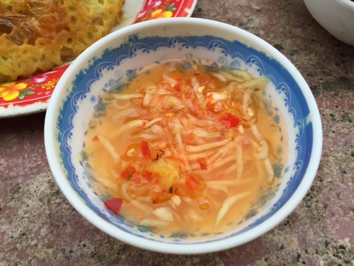 Nước mắm cốt được pha chua ngọt vừa ăn, có sợi đu đủ bào mỏng ăn kèm