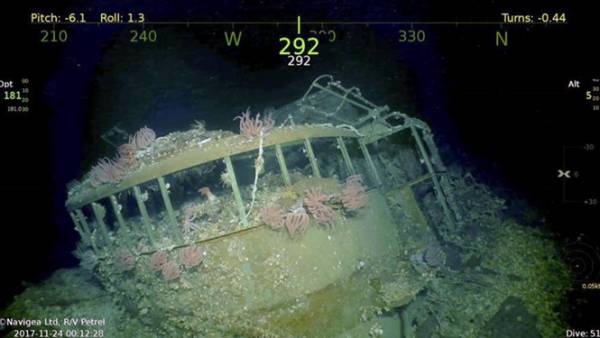 Ảnh đăng trên trang facebook của đồng sáng lập hãng Microsoft, ông Paul Allen, cho thấy một xác tàu, có thể là một trong các tàu chiến Nhật Bản bị đánh đắm trong Thế chiến thứ 2.
