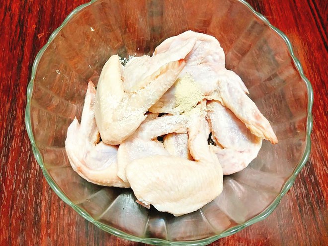 - Bước 2: Cho cánh gà vào âu cùng với 1 chút muối, bột nêm, tiêu trắng, rượu và trộn đều, ướp khoảng 30 phút cho ngấm gia vị.