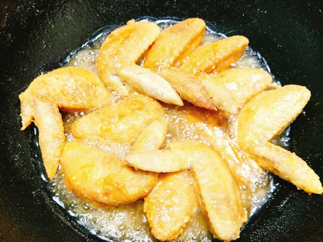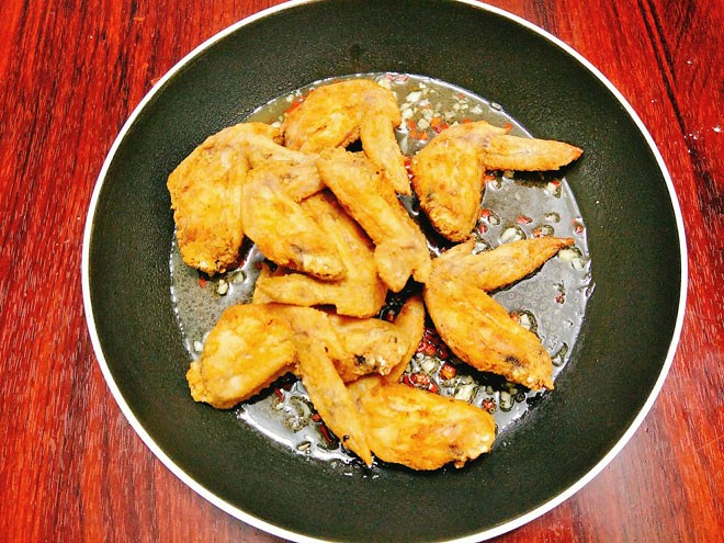 Cuối cùng bạn trút cánh gà đã chiên vào xóc đều cho ngấm gia vị là tắt bếp, bày ra đĩa thưởng thức.