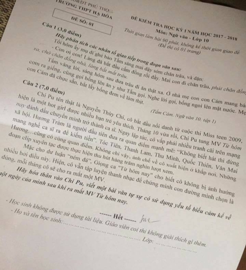Mới đây, mạng xã hội chia sẻ ảnh chụp đề thi học kỳ 1 môn Ngữ Văn dành cho học sinh lớp 10 của trường THPT Hạ Hòa, Phú Thọ. Trong câu hỏi 7 điểm, đề bài đề cập đến chuyện ca sĩ - hot girl Chi Pu đi hát gây ồn ào trên mặt báo và Facebook suốt thời gian qua.
