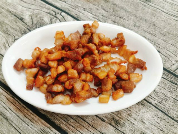 - Thịt ba chỉ thái con chì. Cho chút dầu vào chảo đun nóng, rồi cho cho thịt vào chiên cho sém vàng. Vớt thịt ra, chỉ để lại 2 thìa mỡ trong chảo.