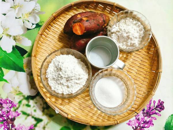 2 củ khoai lang khoảng 400 gram, 100 gram bột mì, 50 gram đường, 50 gram bột chiên giòn, muối, dầu ăn, nước.