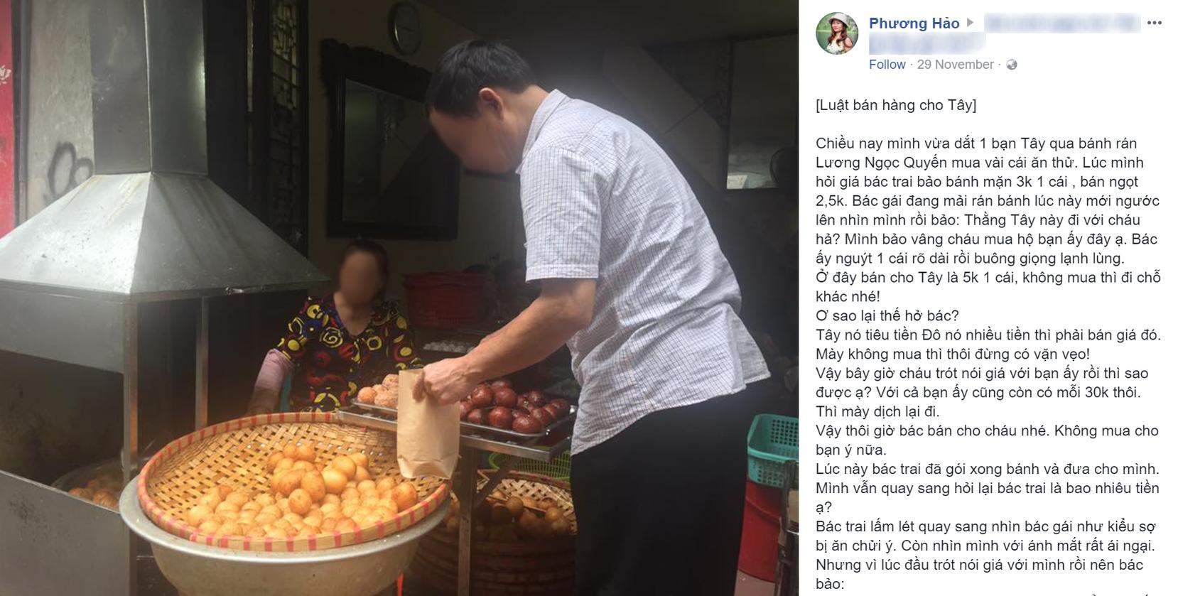 Theo đó, Phương Hảo cho biết chiều 29/11, cô đưa một người bạn nước ngoài qua phố Lương Ngọc Quyến mua một vài chiếc bánh rán để ăn thử và được báo giá là 3.000 đồng cho 1 chiếc bánh rán mặn, bánh ngọt là 2.500 đồng. Tuy nhiên, khi biết người cần mua bánh là người bạn Tây của Hảo chứ không phải cô, bà chủ tiệm bánh rán đã tự động "nâng giá" lên 5.000 đồng bằng một câu nói tỉnh bơ: "Ở đây bán cho Tây là 5.000 đồng 1 cái, không mua thì đi chỗ khác!" và yêu cầu Hảo dịch lại như thế.