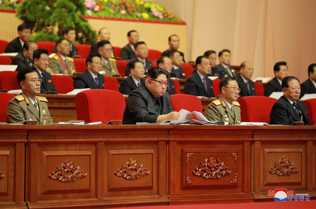 Nhà lãnh đạo Kim Jong-un tham dự hội nghị cùng các quan chức Triều Tiên (Ảnh: Reuters)