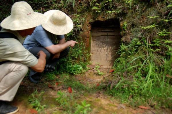 Các nhà khảo cổ học đi qua một cánh cửa gỗ kỳ lạ nằm ẩn vào phía bên sườn đồi.