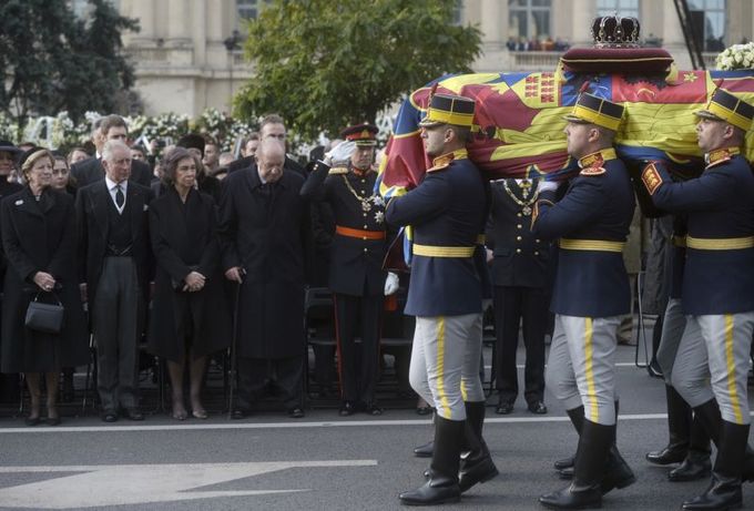 Từ trái sang phải: Hoàng thân Lorenz đứng cạnh vợ là Công chúa Astrid nước Bỉ, Thái hậu Muna al-Hussein của Jordan, Hoàng hậu Anne Marie của Hy Lạp, Thái tử Charles nước Anh, Thái hậu Sofia và chồng, Thái thượng hoàng Tây Ban Nha Juan Carlos I, Đại công tước Henri xứ Luxembourg, Hoàng hậu Silvia và Vua Carl XVI Gustaf của Thụy Điển, đứng hàng đầu dự lễ tang.