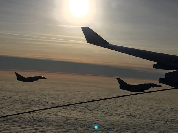 The Telegraph viết rằng sau khi tiếp cận máy bay có bà May ngồi trên khoang, hai chiếc "Typhoon" đã lắc cánh, dấu hiệu có nghĩa là yêu cầu phải bay theo họ.