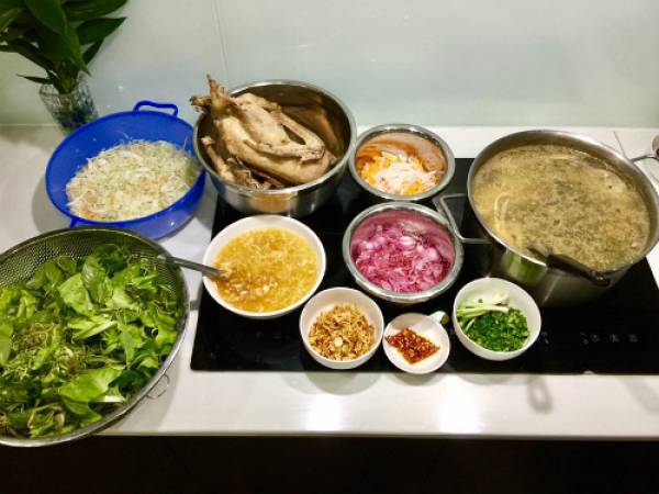 - Để món ăn thơm ngon hơn bạn cần chuẩn bị thêm hành tím bào mỏng, xốc với đường bỏ tủ lạnh 15 phút lấy ra, chế giấm gạo vào, nêm sao ngọt chua vừa miệng. Củ cãi trắng và cà rốt cắt sợi rồi cũng xốc đường, sau đó chế giấm y như trên. Chuẩn bị thêm các loại rau thơm ăn kèm.