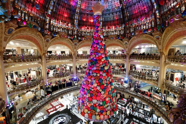 Cây Giáng sinh khổng lồ trong siêu thị ở Paris, Pháp.