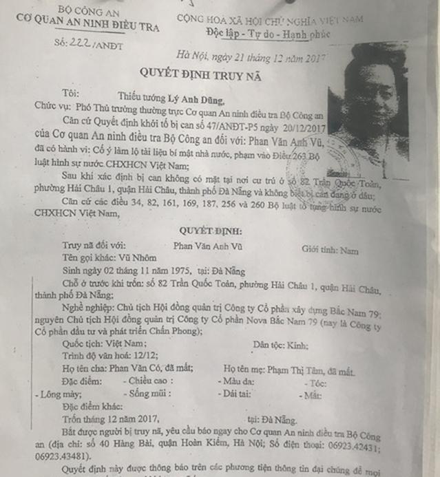 Quyết định truy nã do thiếu tướng Lý Anh Dũng - phó thủ trưởng thường trực Cơ quan An ninh điều tra, Bộ Công an - ký ngày 21/12, một ngày sau khi ông Phan Văn Anh Vũ bị cơ quan này khởi tố bị can về tội "cố ý làm lộ tài liệu bí mật nhà nước" theo điều 263 Bộ luật hình sự.