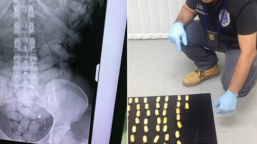 Người phụ nữ đến từ Bờ Biển Ngà nuốt hơn 1 kg ma túy vào bụng. Cô này đã bị bắt giữ tại sân bay Thái Lan. Thiết bị an ninh phát hiện hàng chục gói ma tuý nhỏ trong bụng người phụ nữ này.