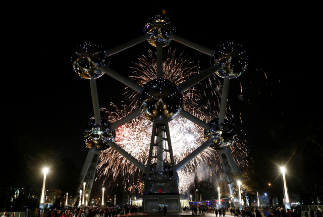 Pháo hoa tại công trình Atomium nổi tiếng ở thủ đô Brussels, Bỉ (Ảnh: Reuters)