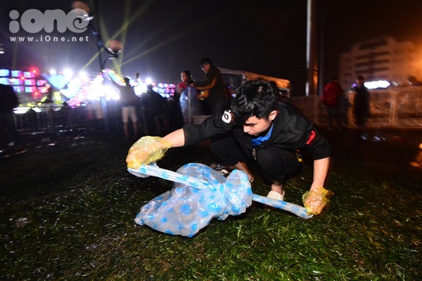 Áo mưa được người dân trưng dụng che mưa, bao ni lông đựng thức ăn, vỏ chai đựng nước bị bỏ lại trên các thảm cỏ, đường nhựa.