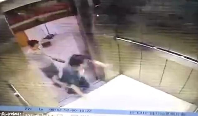 Người phụ nữ không may bước vào thang máy đang di chuyển.