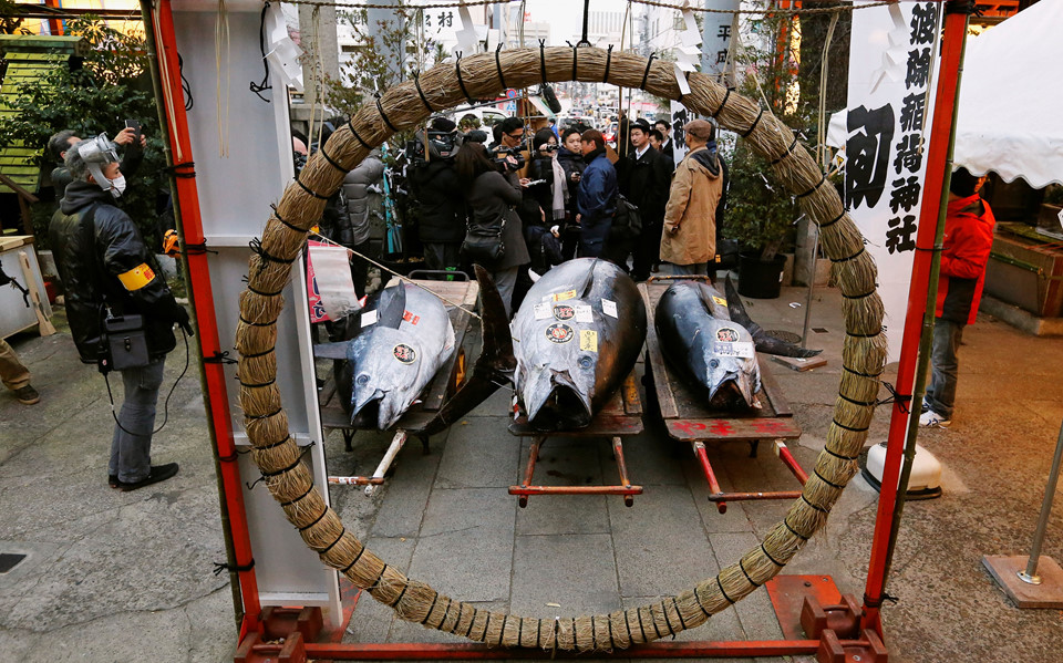 Ba con cá ngừ nặng nhất trong buổi đấu giá sáng 5/1 đang chuẩn bị được tiến hành một nghi lễ của Thần đạo, tôn giáo truyền thống của Nhật Bản. Sau hơn 80 năm hoạt động, chợ cá Tsukiji sắp bị đóng cửa do sự xuống cấp của cơ sở vật chất dẫn tới lo ngại về an toàn thực phẩm, vệ sinh và an toàn cháy nổ. Ảnh: Reuters.