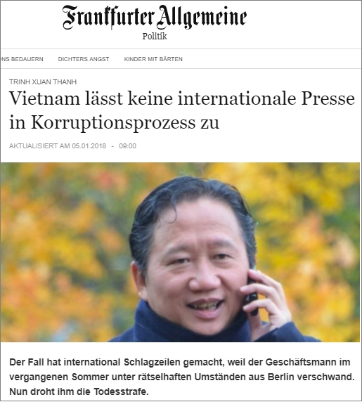 Hôm Thứ Sáu 5.1.2018, Bộ Ngoại giao Đức ở Berlin đã triệu tập Đại sứ Việt Nam tại Đức Đoàn Xuân Hưng lên để trao đổi về các vấn đề liên quan đến phiên tòa xét xử ông Trịnh Xuân Thanh, nhưng cho đến giờ phút này vẫn chưa rõ là Đại sứ quán Đức ở Hà Nội có được tham dự phiên tòa xét xử Trịnh Xuân Thanh hay không?