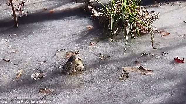 Vietbf.com - Một đầm lầy kết băng sông Shallotte ở Mỹ khiến cá sấu trồi mõm qua khe nứt hẹp nơi đầm này đã tự "hóa đá", khi bị con người giẫm lên thì không biết chuyện gì sẽ xảy ra cho những chú cá sấu bị đóng băng vươn mõm khỏi bề mặt đầm lầy.