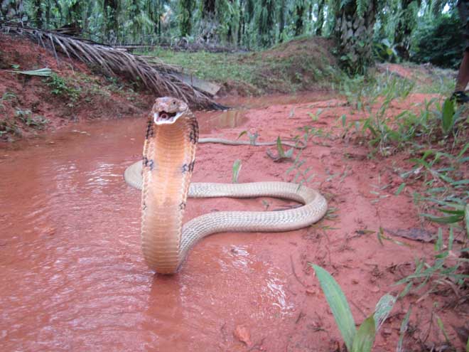 Hiện chưa rõ hổ mang chúa cắn chết người đàn ông xấu số, nhưng một số nhân chứng nói họ nhìn thấy con rắn dài tới hơn 4 mét xuất hiện ở khu vườn dầu cọ.