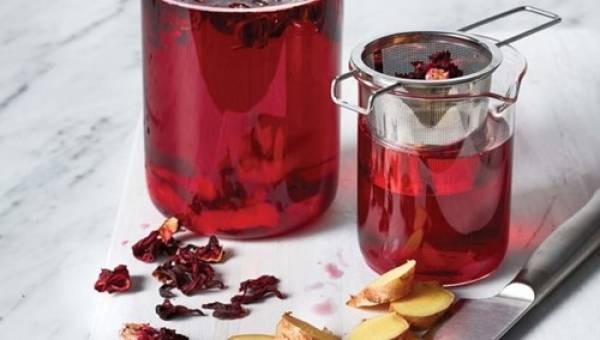 Cho hoa dâm bụt và gừng vào một tô lớn. Đổ 2 ly nước sôi vào và ngâm trong 10 phút. Lọc lấy nước và khuấy đều cùng mật ong, đồ uống đã sẵn sàng.