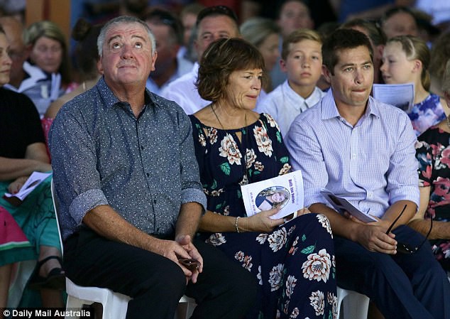 Cha của Butcher (bên trái) - ông Ron và mẹ Wendy của cô (người ngồi giữa); bên cạnh là người bạn đời Luke ngồi ở hàng ghế đầu tại đám tang của Butcher.