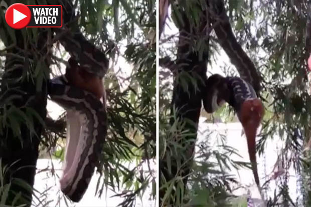 Đoạn clip được một người phụ nữ Australia ghi lại khi chứng kiến một con trăn 3 mét trên cây. Con trăn này đang vật lộn để nuốt con chồn trong tư thế treo ngược cành cây.