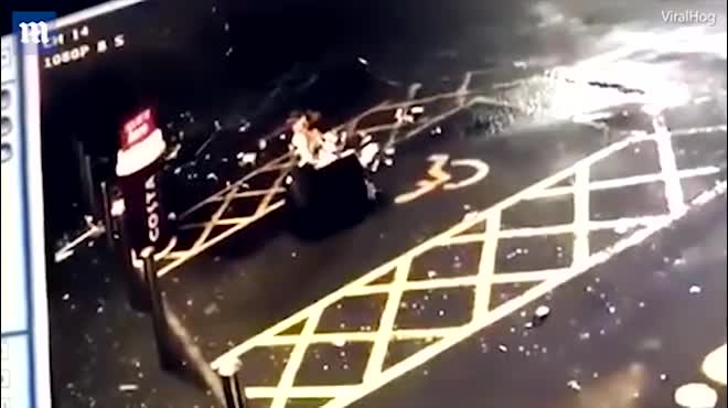 Đoạn video do camera giám sát ghi lại cho thấy tên trộm văng lên trên không, sau khi hắn dùng khí gas để phá một cây rút tiền tự động (ATM) ở thành phố Clydebank, Scotland.